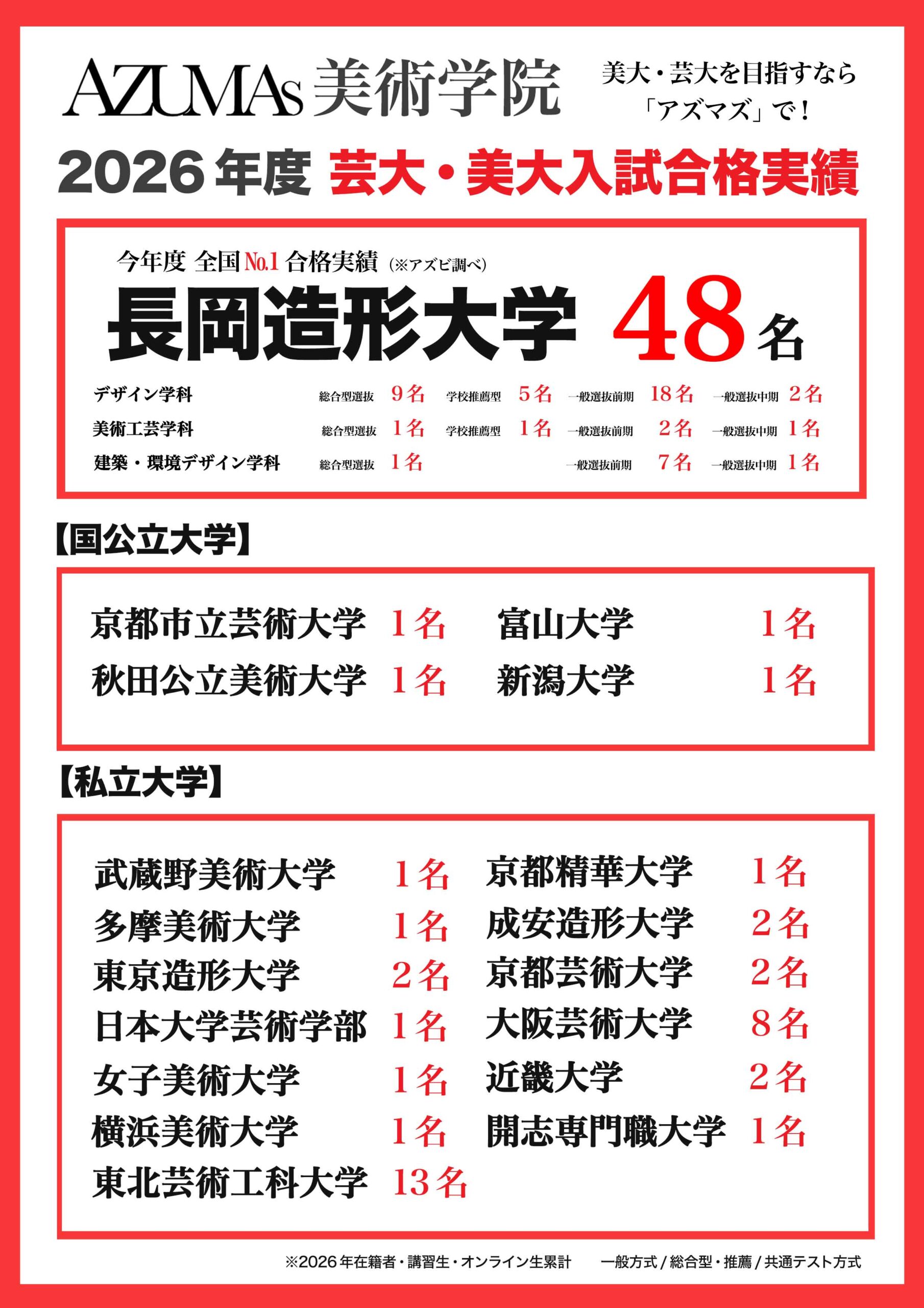 AZUMAs美術学院長岡校は、学校法人が教育事業として運営する美大受験予備校であり、これまで美術の道を目指す多くの新潟の学生を指導してきました。